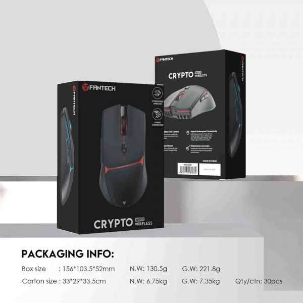 | O proizvodu | Fantech Crypto bežični WGC3 miš za igranje Povezivost: StrikeSpeed ??bežični Polling rate: 1000Hz Senzor: Pixart 3325 senzor DPI: 400 - 10000 Tip prekidača: mehanički prekidač Životni vijek klika: 20 milijuna klikova Vrsta oblika: simetrična Brzina/Ubrzanje: 100IPS/20G Ugrađena memorija: Da Programabilni gumbi: 6 Baterija: 300mAh JAMSTVO 12 MJESECI |