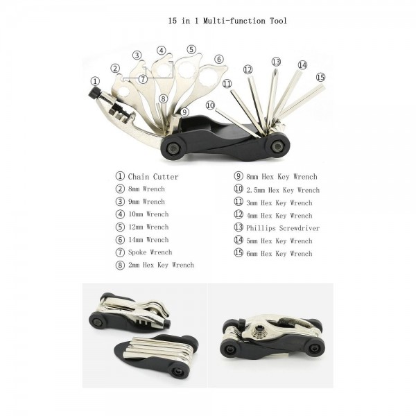 | O proizvodu | Praktičan servisni komplet omogućuje brzi popravak u slučaju kvara bicikla. To je praktičan i bitan servisni komplet za bicikliste. Kao putni komplet, može pomoći kod većine problema s biciklom i osnovnog održavanja, pa čak i kao alat za svakodnevni popravak kod kuće. Alati u servisnom kompletu pomoći će u hitnim slučajevima. Komplet ključeva omogućuje manje popravke. Samoljepljivi flaster djeluje u slučaju oštećenja zračnice na cesti. Komplet je pogodan za sve vrste bicikala kao što su cestovni bicikli, brdski bicikli, bicikli sa zupčanicima itd. Komplet uključuje: – torbu – šesterokutni imbus ključ – imbus ključ – 15-u-1 alat – 3 metalna spudgera – 6 zakrpa za gume – turpije |