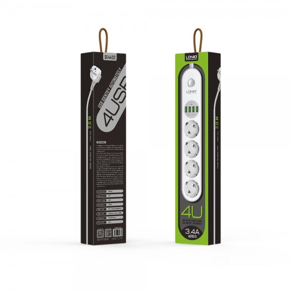 Ldnio PRODUŽNI KABEL SE4432 4*USB (3.4A AUTO MAX) + 4*220 V 2 m - PT-LDN-SE4432 - SMART HOME