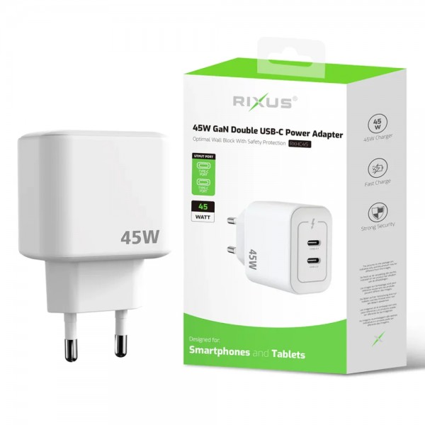 Rixus kućni punjač / adapter RXHC45 45W GaN 2x USB Tip-C (Bijeli)