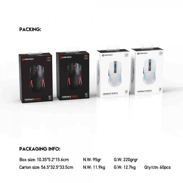 | O proizvodu | Senzor: gejmerski senzor Pixart 3212 Ubrzanje: do 30 IPS / 10G DPI: on-the-fly od 800 do 2.400 DPI Polling Rate: 150 Hz RGB: Da Životni vijek: 20 milijuna klikova (Huano prekidači) Kapacitet baterije: 400 mAh Bežična udaljenost od računala: 10 m Ergonomski dizajn prilagođen za lijevu i desnu ruku Dimenzije: 130*78*38 mm Težina: 107 g Fantech WGC2 Venom II je opremljen Pixart 3212 senzorom, Huano prekidačima sa životnim vijekom od 20 milijuna klikova i ugrađenom baterijom od 400 mAh. Ovo je inovativan proizvod čija je cijena sasvim prihvatljiva za bilo kojeg igrača. Uređaj se uspješno nosi sa svojim glavnim funkcijama i pomoći ce vam da postignete uspjeh u cyber bitkama. JAMSTVO 12 MJESECI |