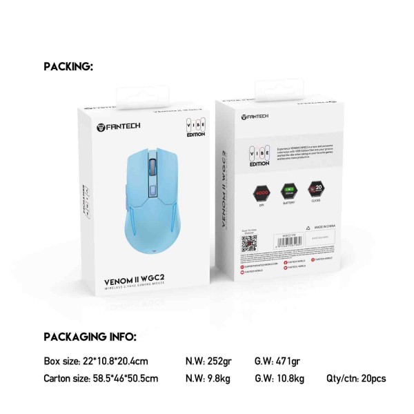 O proizvodu Senzor: gejmerski senzor Pixart 3220 Ubrzanje: do 30 IPS / 10G DPI: on-the-fly od 800 do 4.000 DPI Polling Rate: 125 Hz RGB: Da Životni vijek: 20 milijuna klikova (Huano prekidači) Kapacitet baterije: 300 mAh Bežična udaljenost od računala: 10 m Ergonomski dizajn prilagođen za lijevu i desnu ruku Dimenzije: 130*78*38 mm Težina: 95 g Fantech WGC2 Venom II Vibe opremljen je Pixart 3220 senzorom, Huano prekidačima sa životnim vijekom od 20 milijuna klikova i ugrađenom baterijom od 300 mAh. Ovo je inovativan proizvod čija je cijena sasvim prihvatljiva za bilo kojeg igrača. Uređaj se uspješno nosi sa svojim glavnim funkcijama i pomoći ce vam da postignete uspjeh u cyber bitkama. JAMSTVO 12 MJESECI
